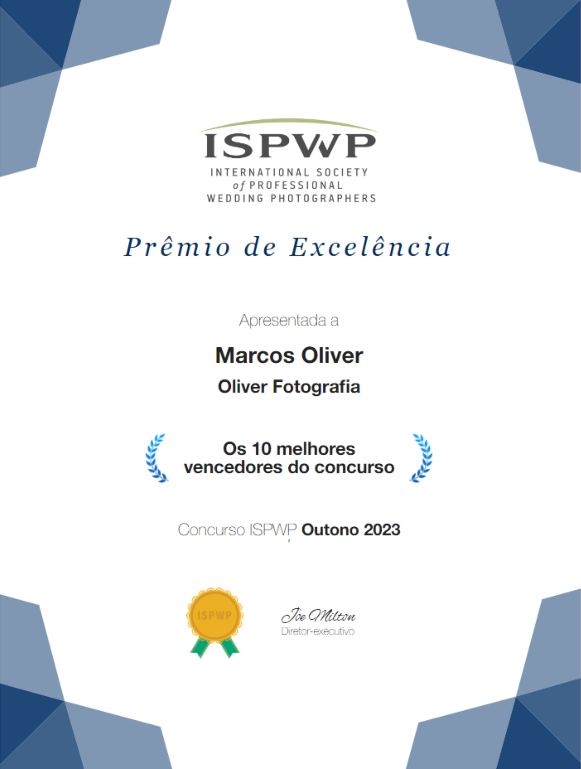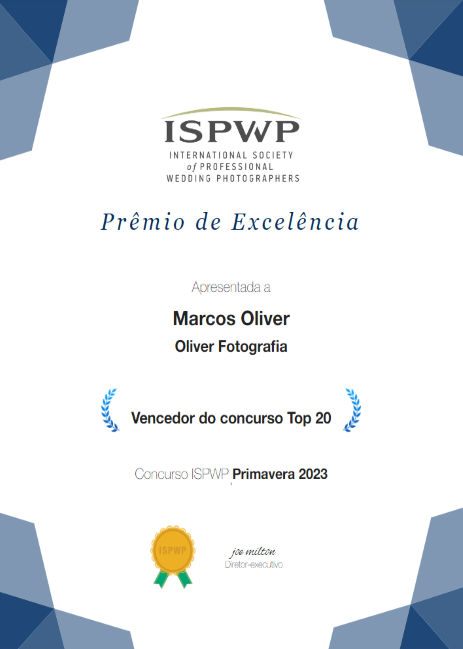 Além disso, em 2023, Oliver foi reconhecido como o fotógrafo mais premiado do Brasil pela Associação Instinto Criativo. Ele também integrou o seleto TOP 5 MUNDIAL da ISPWP/ International Society of Professional Wedding Photographers, considerada a maior associação de fotografia de casamentos do mundo, na atualidade.